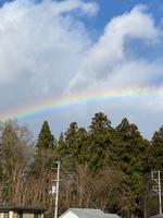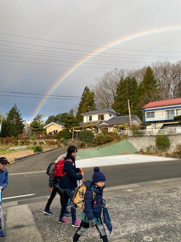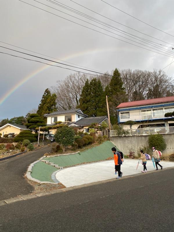 すてきな虹の朝でした。「うわあ、きれい。」「2本見えます。2本目の虹は色の並びが反対になっている⁉」