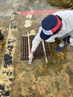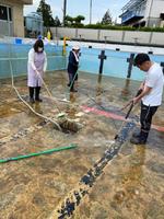 プールに入り込んだ大量の土砂や葉っぱをすくいとる作業中に「キャー!!」の叫び声が。オタマジャクシやカエルもいっぱいいたのです!