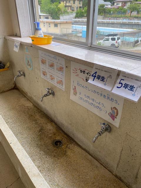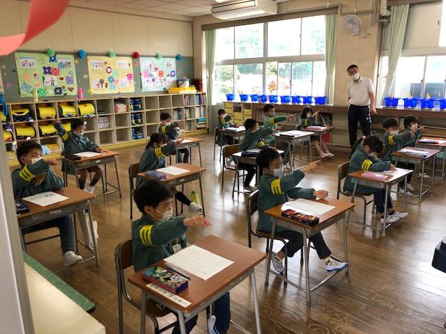 今週から下川崎小学校でも分散登校が始まりました。18日(月)は1・4・6年生が元気に登校し、久しぶりに授業を受けていました。