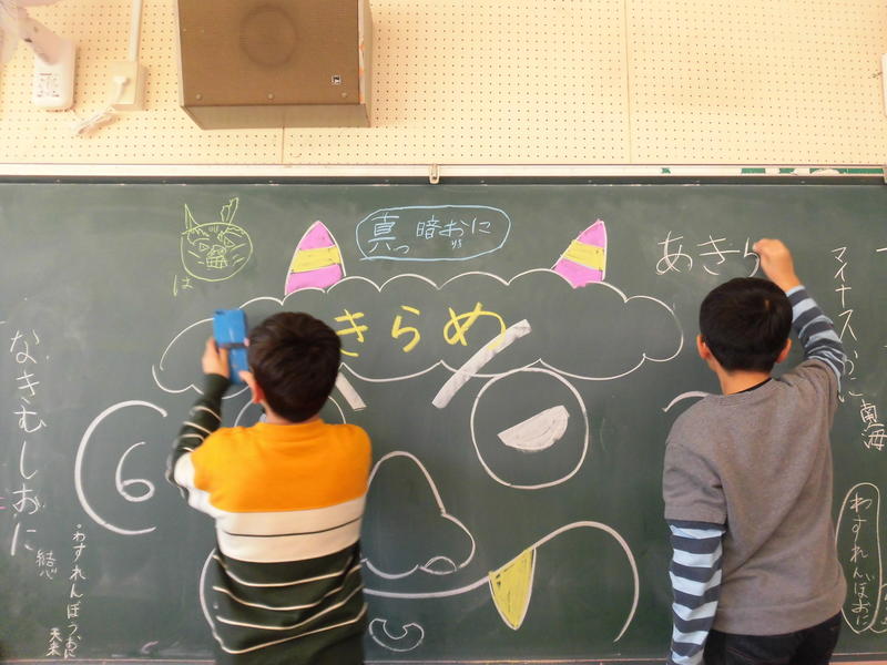 3年生は黒板にかいて鬼退治!