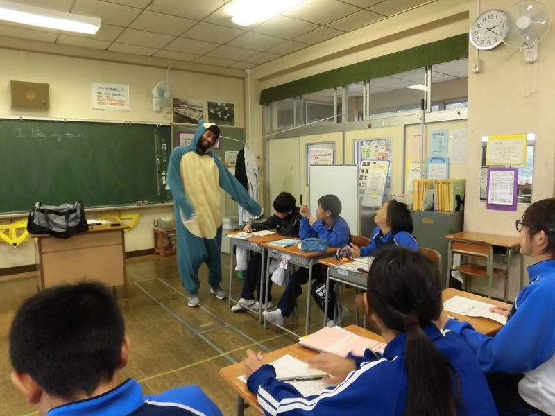 10月31日はハロウィン。10月29日(火)のALTの先生の授業はポケモンの『カビゴン』姿でした!