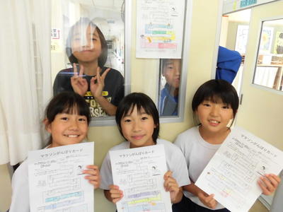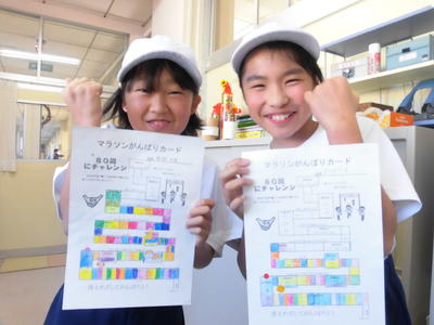 学年ごとにマラソンカードがあり、校庭一周につき1マス色を塗ってゴールを目指します。