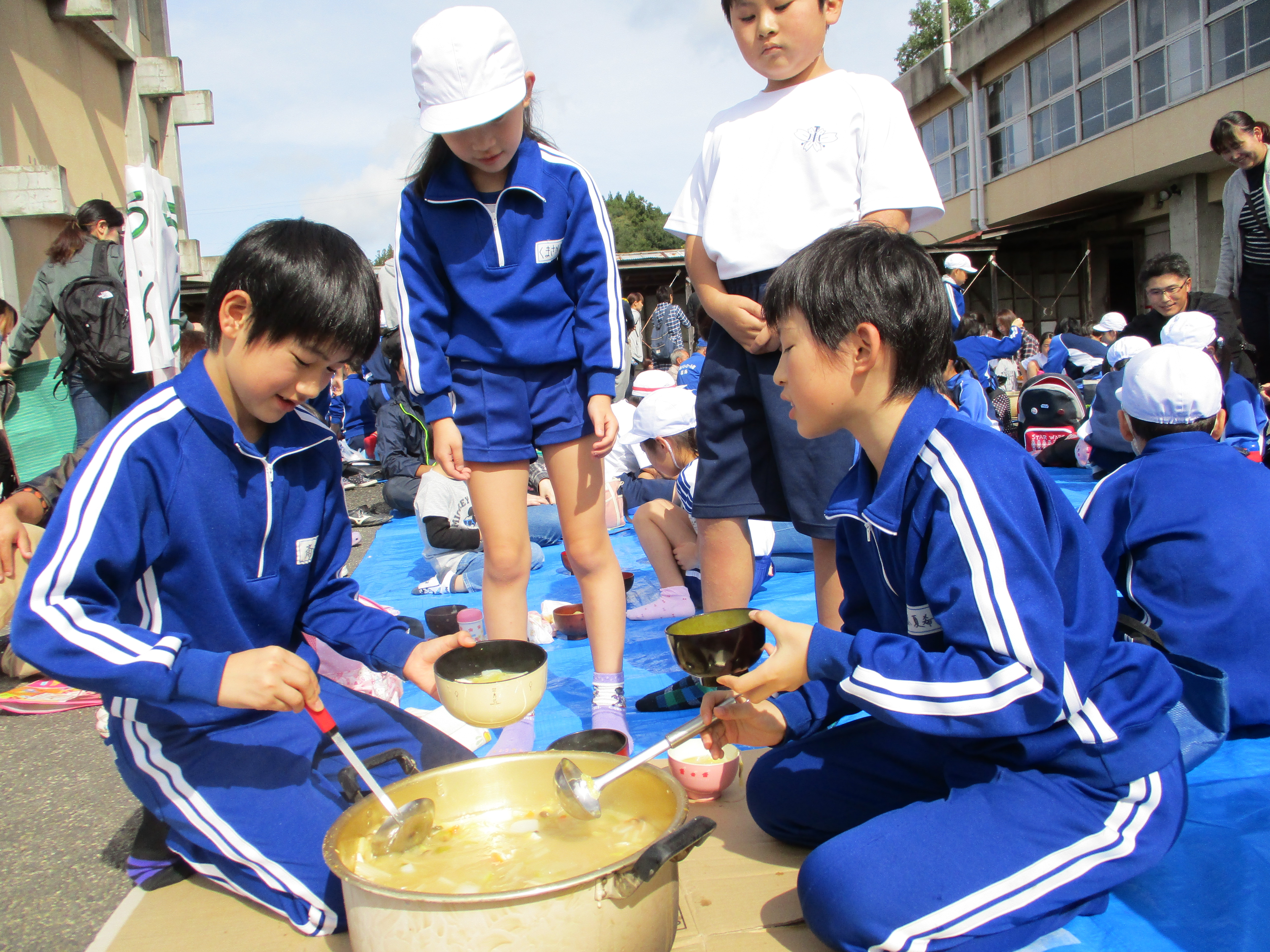 わかたけ班のみんなで協力し、来賓・保護者の皆さまにもお手伝いいただき、具沢山のおいしい豚汁ができました。