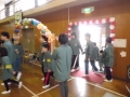 会場である体育館は,ステージ正面に大きな花束が飾られたり,周りにはメッセージ入りの桜の花が飾られたりと,とても華やかな雰囲気に包まれています。その中を6年生が,1年生と手をつなぎ,音楽に合わせて入場しました。とっても温かい雰囲気でみんな笑顔で送る会がスタートしました。