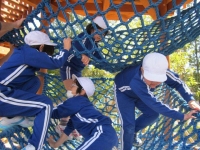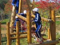 遠足当日,それぞれの班は計画にしたがい,いろんな遊具の場所に行って,互いが協力して楽しみました。班の中のある子がゆれるつり橋で「ああ,こわいよう。」と言っているときに,上級生が「大丈夫だよ。」と言いながら手伝ってくれたり,下級生が迷子にならないように上級生が「こっちだよ。」と教えてくれたりしました。