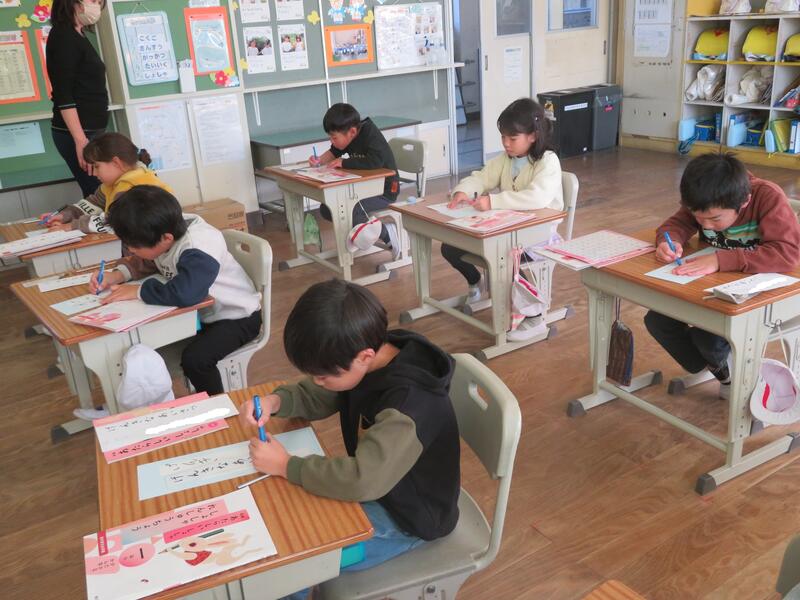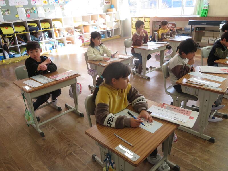 1年生が書写の時間に書初め練習をしていました。