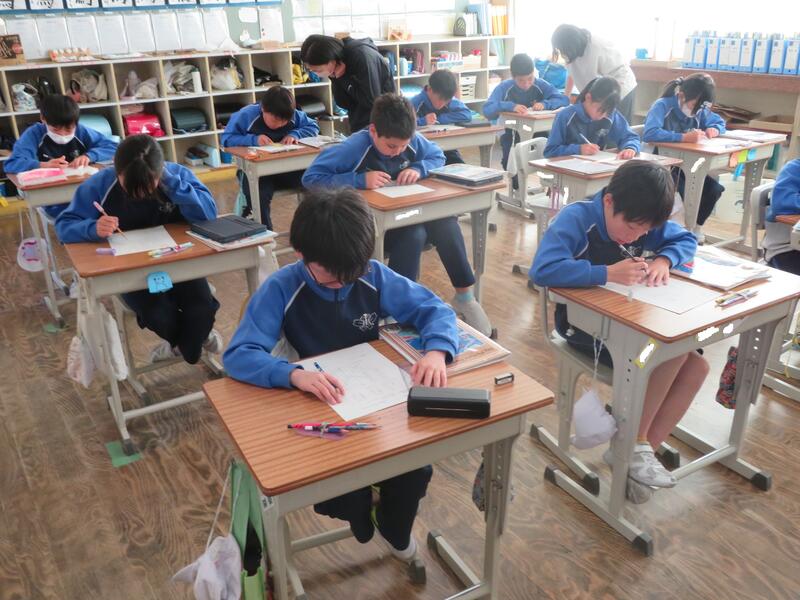 左に置いたお手本を見ながらていねいに書いていました。