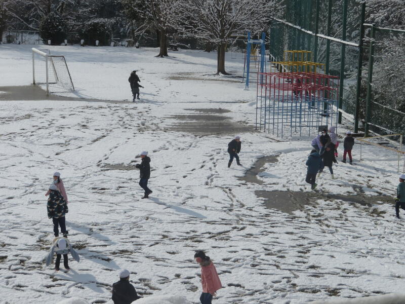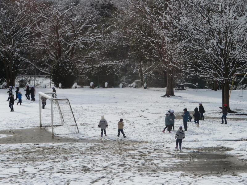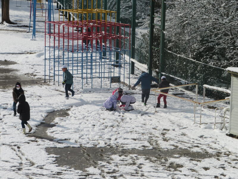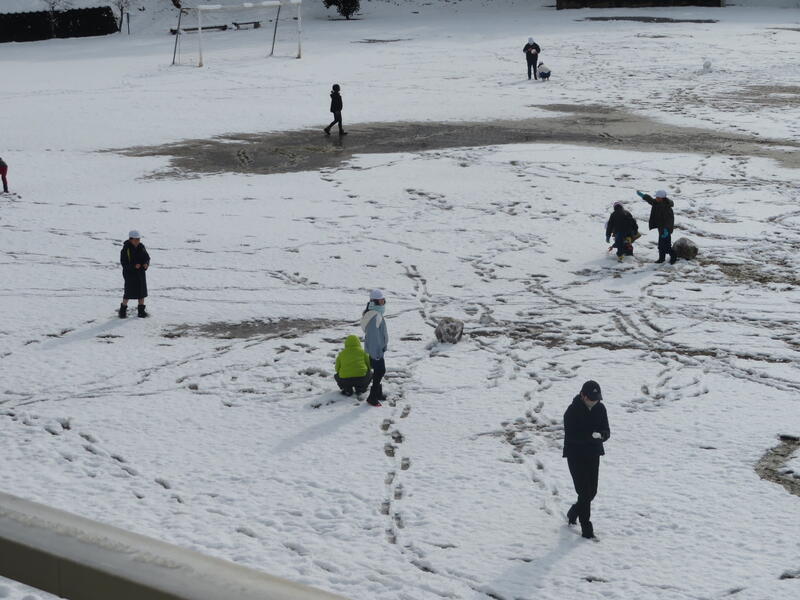 今日は公邸に雪が積もり、休み時間にみんなで雪遊びをしました。