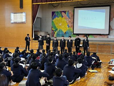 体育館では、新生徒会本部役員が中学校についてわかりやすくスライドや動画を使って説明してくれました。