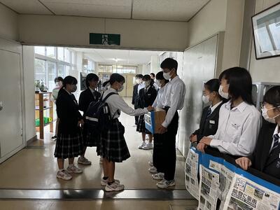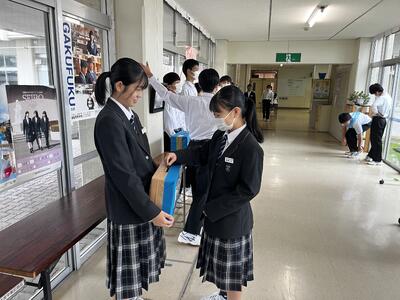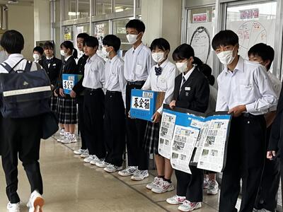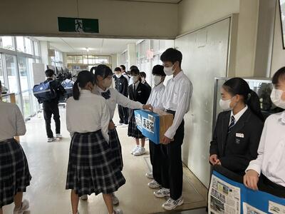 係が毎朝、7時半から7時50分まで、昇降口付近に募金箱と新聞記事を持ち、全校生徒にお願いしてきました。