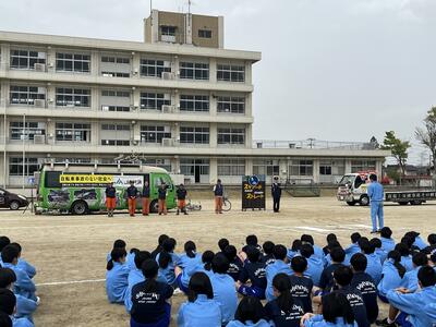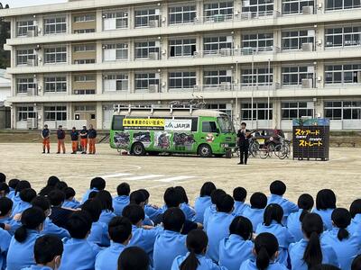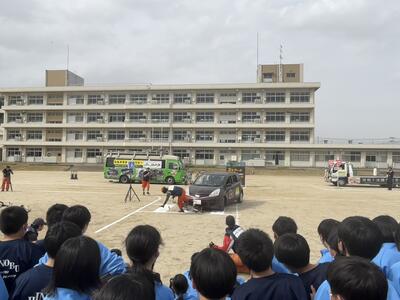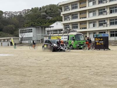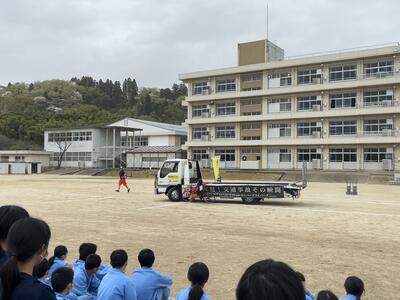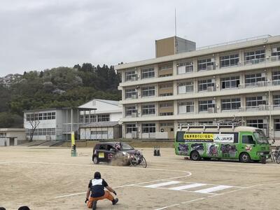 午後から校庭で生徒向け自転車交通安全教室「スケアード・ストレート」を見ることができました。