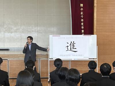 その後、今年の学年スローガンが発表されました。昨年度の「基」から「進」になりました。