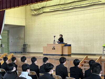 3校時目、体育館で3年生が最後の学年集会を開きました。