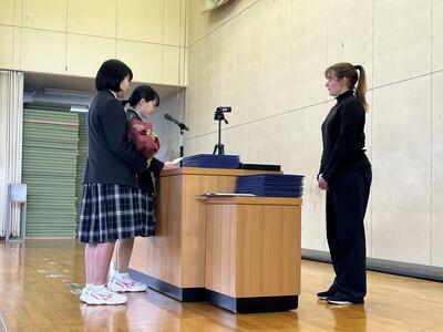 生徒代表として、3年生の2名がメッセージを日本語と英語で伝えて、感謝の意味を込めて花束も贈りました。