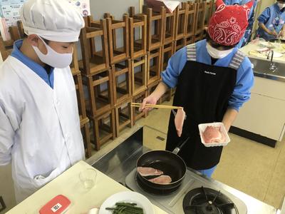 フライパンで肉を焼く時も、各班ごとにさまざまな焼き方があり工夫していました。