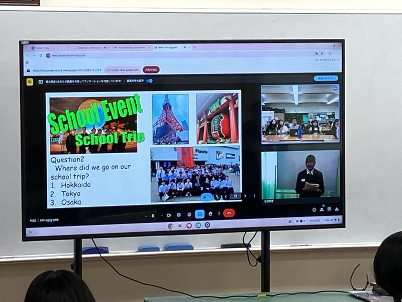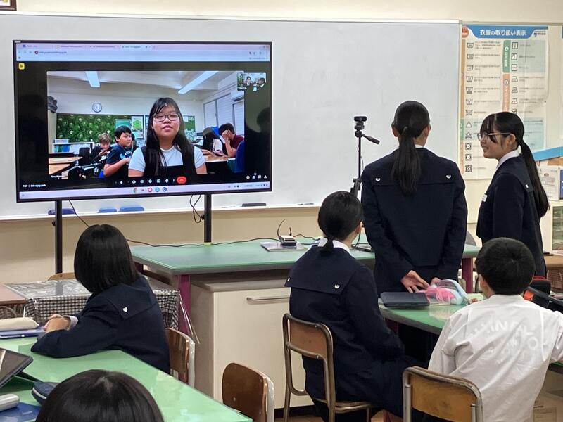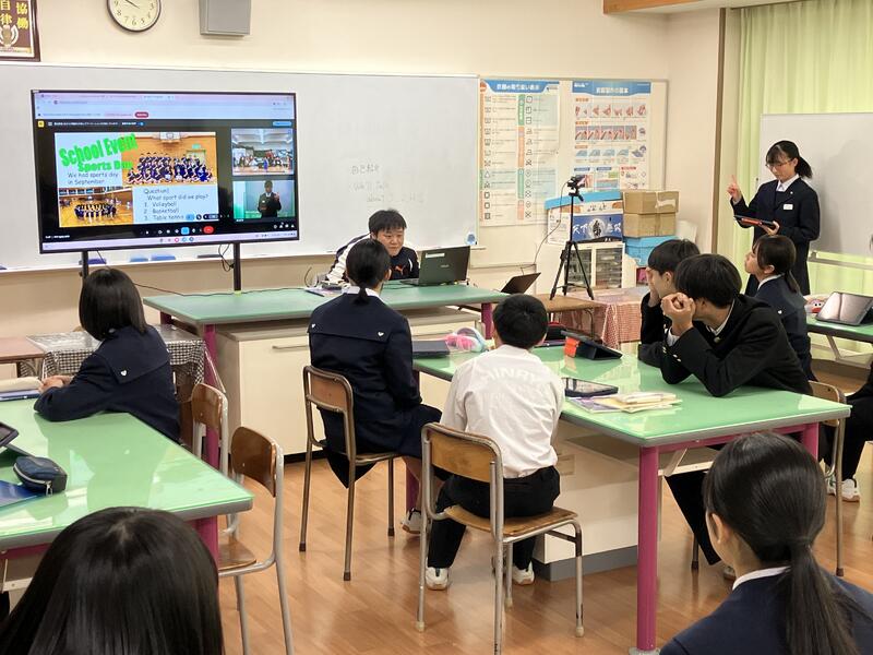 交流したのは3年5組の生徒たちで、事前に本校を紹介するスライドを英文や画像を交えて作成し、それを英語を使って現地の生徒たちに伝えました。