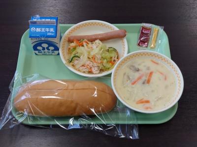 3月1日(月)の給食は、切れ目入りコッペパン、フランクフルトソーセージ、ケチャップ&マスタードソース、イタリアンサラダ、クリームスープ、牛乳でした。