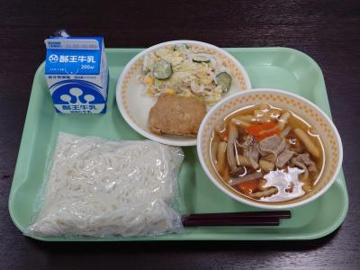 3月2日(火)の給食は、「かみかみ献立」で、ソフトめん、五目うどんかけ汁、きのこの信田煮、切り干し大根サラダ、牛乳でした。