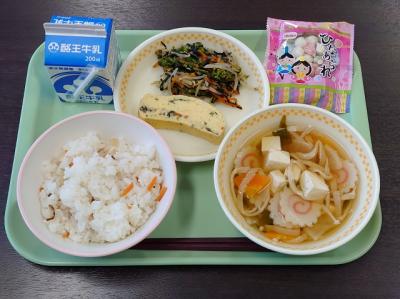 2021年3月3日 13時01分3月3日(水)の給食は「ひなまつり献立」で、ちらしずし、五目厚焼き玉子、菜の花のからし和え、すまし汁、ひなあられ、牛乳でした。