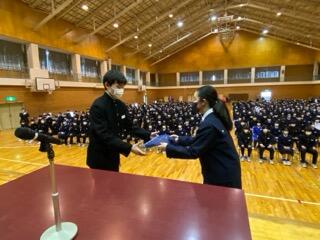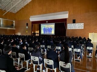 生徒総会に続いて3年生を送る会が行われました。在校生からのメッセージ、記念品贈呈の後に各部で作成した感謝の気持ちのこもった動画が流れました。