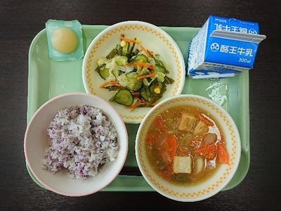 6月27日(木)の給食は、ゆかりごはん、くきわかめサラダ、じゃがいものそぼろ煮、県産一口ももゼリー、牛乳でした。