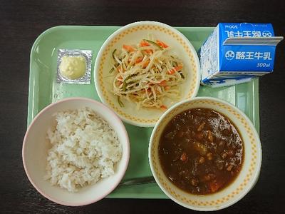6月20日(木)今日の給食は、「かみかみこんだて」で、麦ごはん、かみかみ和え、チキンとひよこ豆のカレー、動物チーズ、牛乳300mlでした。