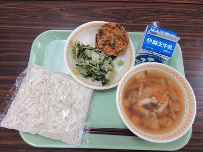 5月14日(火)の給食は、ソフトめん、かき揚げ、梅おかか和え、山菜きつねうどん汁、牛乳でした。