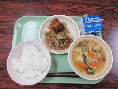 5月15日(水)の給食は、和食の日「まごわやさしい」こんだてで、ご飯、さばのみそ煮、根菜きんぴら、にら玉汁、牛乳でした。