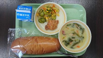 4/15(月)、今日の給食は、照り焼きチキン、コーンサラダ、菜の花ポタージュ、コッペパン、牛乳でした。