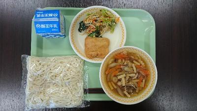 4/16(火)、今日の給食はきつねもち、アーモンド和え、五目うどんかけ汁、ソフトめん、牛乳でした。