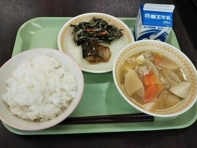 4/17(水)、今日の給食は、さばのおかか煮、のり和え、豚汁、ご飯、牛乳でした。