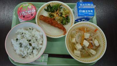 2019年4月18日 15時51分4/18(木)、今日の給食は、入学祝こんだてで、えびフライ、菜の花サラダ、沢煮椀、いちごゼリー、わかめご飯、牛乳でした。