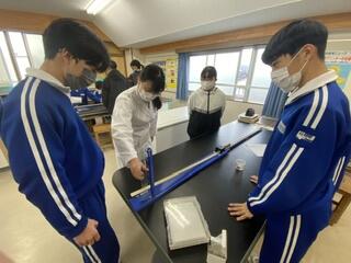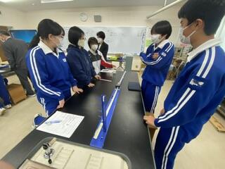3年生理科では,エネルギーと仕事について学習しています。鉄球の高さを変えることで木片の移動距離について実験を通して確かめていました。グラフを用いて丁寧にまとめていました。