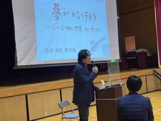昨年の元オリンピック選手に続いて、今日は福島市出身の画家「齋 正機」先生をお招きして「夢がかなうチカラ」というタイトルでお話しをお聞きしました。
