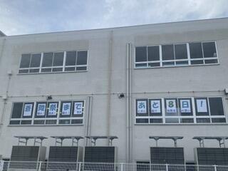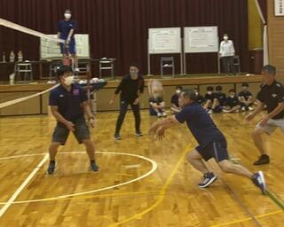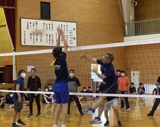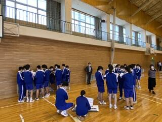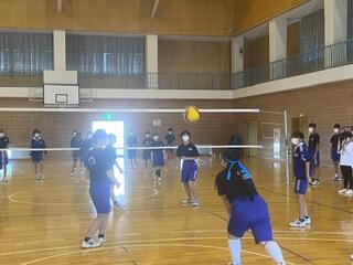 3年生は、今日一日球技大会を楽しんでいます。クラスごとに作られたはちまきを頭にして、バレーでの対抗戦です。