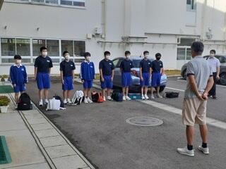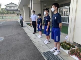 今朝、今日から競技の柔道部が出発しました。今日は,団体戦です。昨日のバスケ部の思いをつないでほしいです。