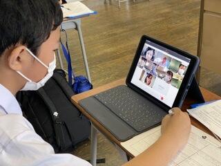 今日は,リモートを使って東京のグループと交流会を行なっています。参加した代表の子どもたちは、自分の思いや考えを英語で伝えることができました。