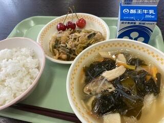 今日は「だいすきふくしまの日」献立として、豚キムチ炒め、トックスープ、さくらんぼ、ご飯、牛乳です。トックスープも,豚キムチも韓国の料理で、日本でも親しまれていますね。梅雨に入り、体調を崩してしまいがちですが,これを食べて元気に乗り越えてほしいです。
