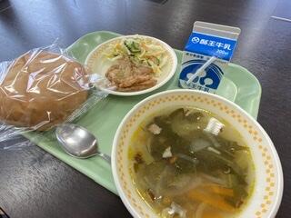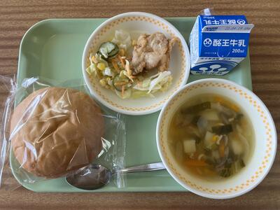 今日の献立は,バーガーパン、フライドチキン、コーンサラダ、マカロニスープ、牛乳です。野菜たっぷりのスープには,ニンジンが入っていて彩りがよく、とても食欲をそそります。子どもたちの大好きなバーガーもチキンを使うことであっさりと誰もが楽しめるものになっていました。いつも食べる人の気持ちを考えている給食センターの職員の方々に感謝していただきました。