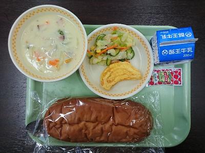 6/10(月)の給食は、くろぱん、県産オムレツ、パックケチャップ、フレンチサラダ、アスパラのクリームスープ、牛乳でした。
