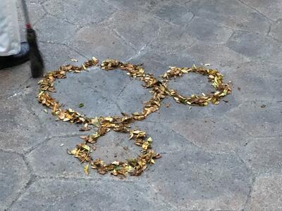 キャストの方が落ち葉で描いてくれたミッキーも楽しみのひとつです。水溜りができたところでは、その水でミッキーを描いてくれたキャストさんもいました。