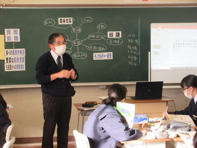 ウェビングマップを使って 2021年12月1日 13時04分 昨日、社会の研究授業が行われました。授業では、アフリカの貧困の原因についてウェビングマップを活用して考えました。また、授業のまとめでは本時の内容から単元を貫く探求課題も設定しました。