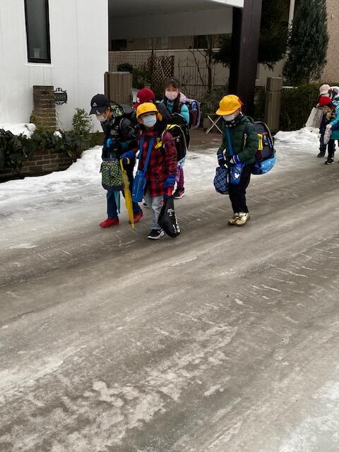 学校周辺は、日陰に圧雪による凍結路がたくさん残り、児童は気を付けて歩いていました。