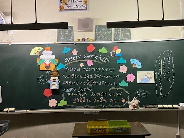 児童が教室に入ると目にするのが「黒板メッセージ」担任の先生方の工夫と思いが伝わってきます。