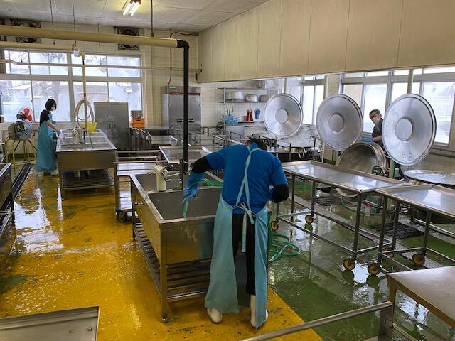 給食室では、明日から始まる給食に向けて、念入りに洗浄が進んでいました。