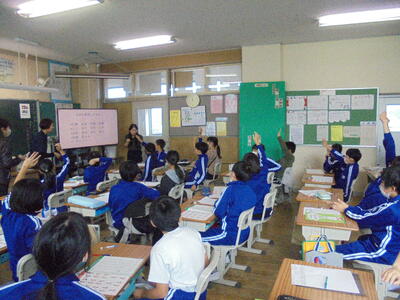 ミュージックチャレンジタイムでは、5年生の代表がハンドベルに挑戦。