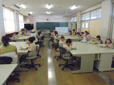 今日は杉妻幼稚園のみなさんが小学校で給食体験で来校しました。