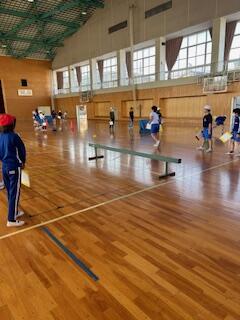 6年生が体育の先生が準備した道具を使ってネット型のゲームをしています。