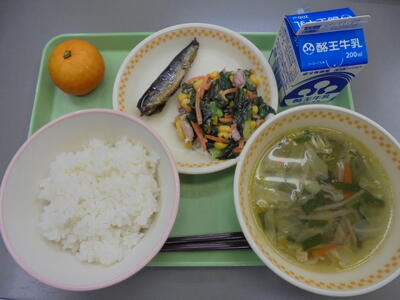 今日の給食は、ごはん、牛乳、イワシ甘露煮、小松菜サラダ、塩野菜スープ、みかんでした。