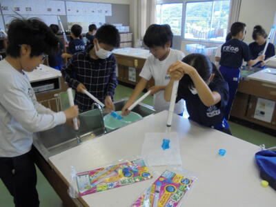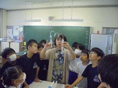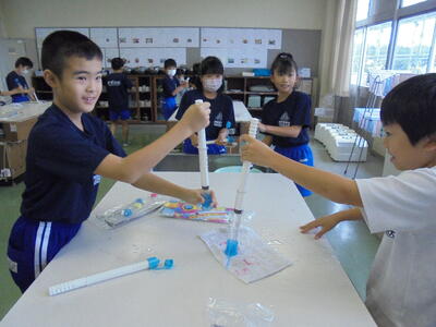 4年生が空気や水の性質の実験をしています。